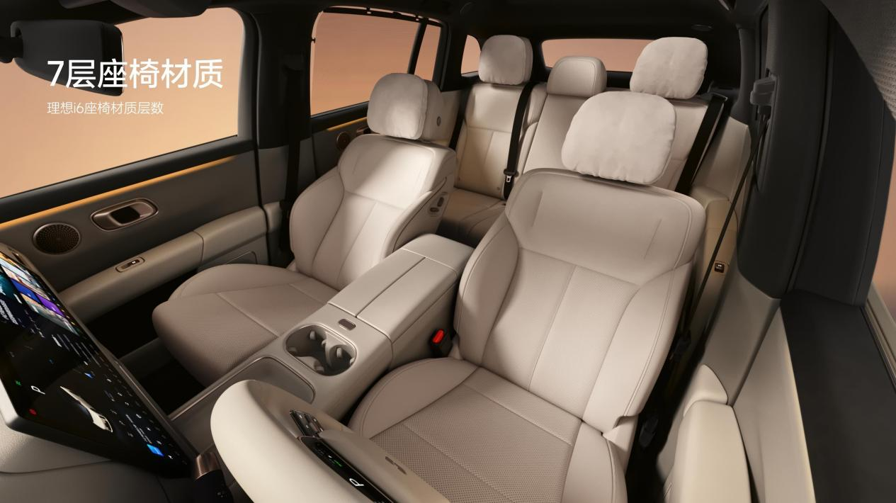 理想i6车长宽高4950x1935x1655毫米,轴距3000毫米,通过低重心和短前后悬设计,打造超过3.3米超大车内纵向可用空间,拥有同级领先的座椅舒适性,全车采用七层材质座椅,标配四座通风、五座加热和前排十点按摩,后排右侧配备皇后座椅。舒适座椅与越级空间搭配8.8升智能冷暖双用冰箱、21.4英寸3K后舱娱乐屏、铂金音响、侧窗隐私帘等豪华配置,为用户提供多种空间模式。“单人床模式”下,1.83米身高也能轻松平躺;“i人空间”功能下,车内侧窗隐私帘打开,同时用户可在后舱娱乐屏调取车外任何一个摄像头,随时观察车外情况,为用户打造私密且安全的独享空间。