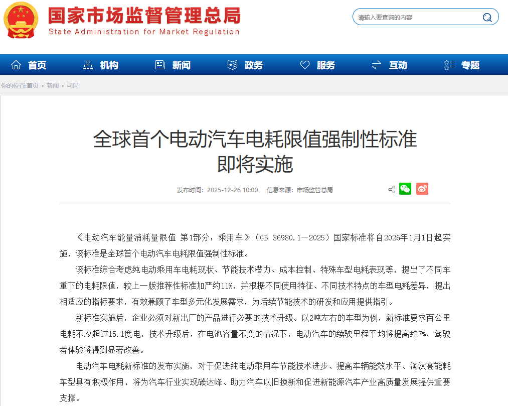12月26日,国家市场监督管理总局公布《电动汽车能量消耗量限值 第1部分:乘用车》(GB 36980.1—2025)国家标准将自2026年1月1日起实施,该标准是全球首个电动汽车电耗限值强制性标准。