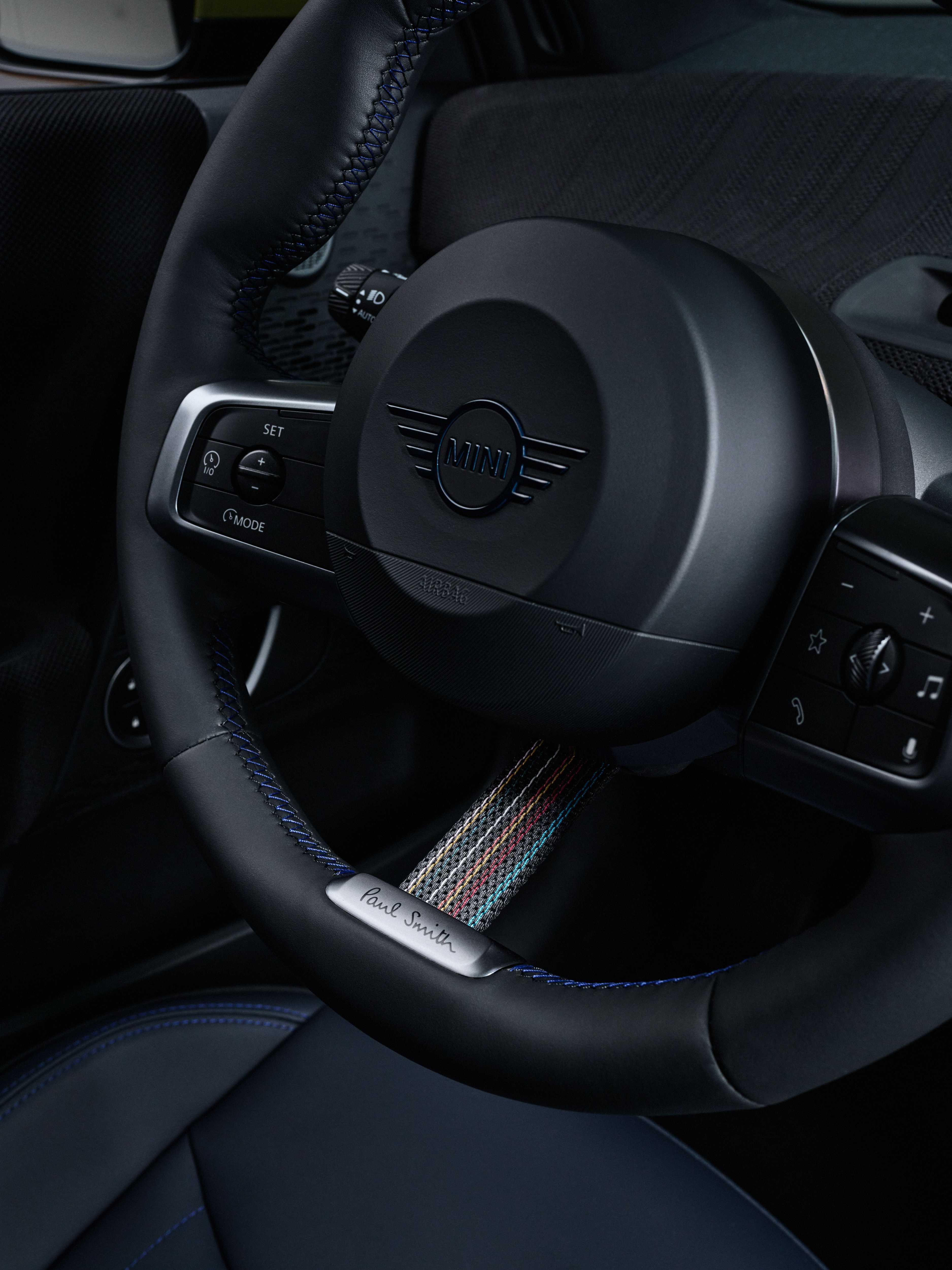 经典彩色条纹是Paul Smith的标志性设计元素。在电动MINI COOPER PAUL SMITH设计师款上,Paul Smith使用了多种装饰细节和工艺呈现经典条纹。比如驾驶员侧车顶上亮眼但克制的彩色条纹装饰、方向盘上低头可见的10色编织彩条绑带、仪表台上利用环保材料立体编织的暗调条纹织物等。