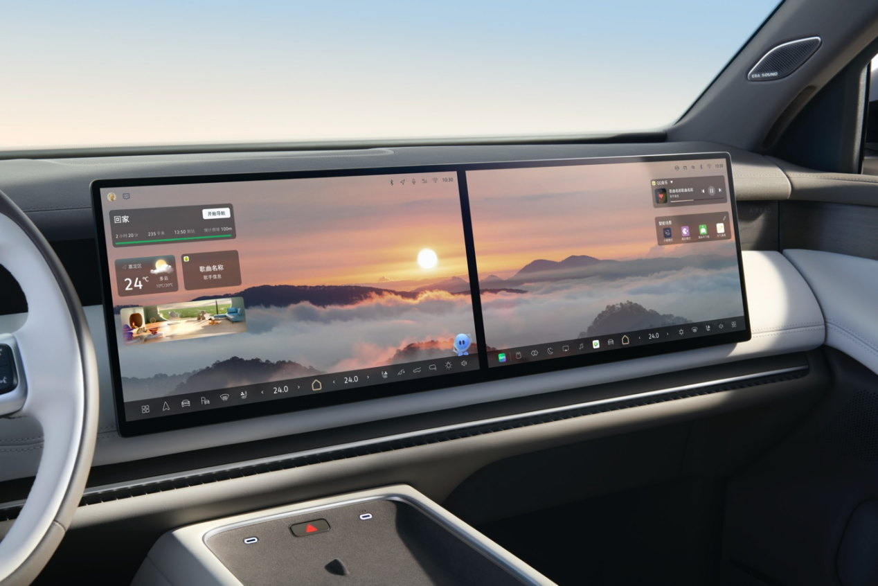ID. ERA 9X在智能与舒适体验上同样出色。15.6英寸超高清中控主副驾双联屏提供高效人机交互;21.4英寸后排可折叠吸顶大屏搭配视角补偿膜,拓展视野,为后排乘员打造沉浸式影音体验。全车氛围灯总长度达12.8米,采用四层环舱式布局,并结合漫反射光学处理技术,光线均匀铺展,如光瀑般晕染座舱,进一步强化环抱感与放松感。